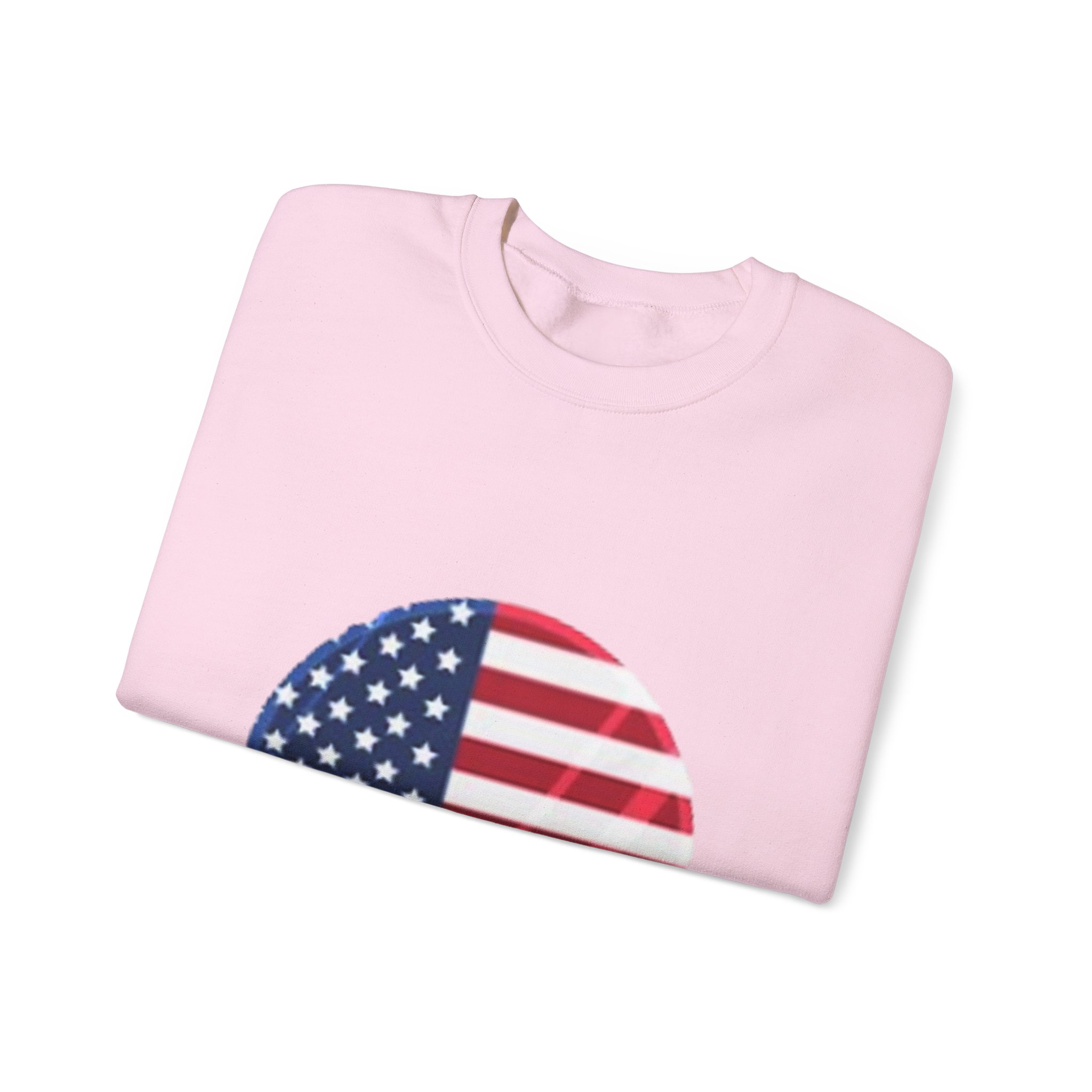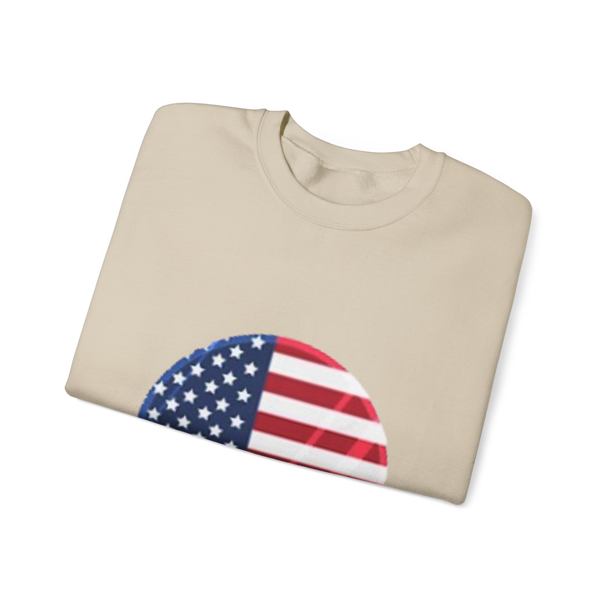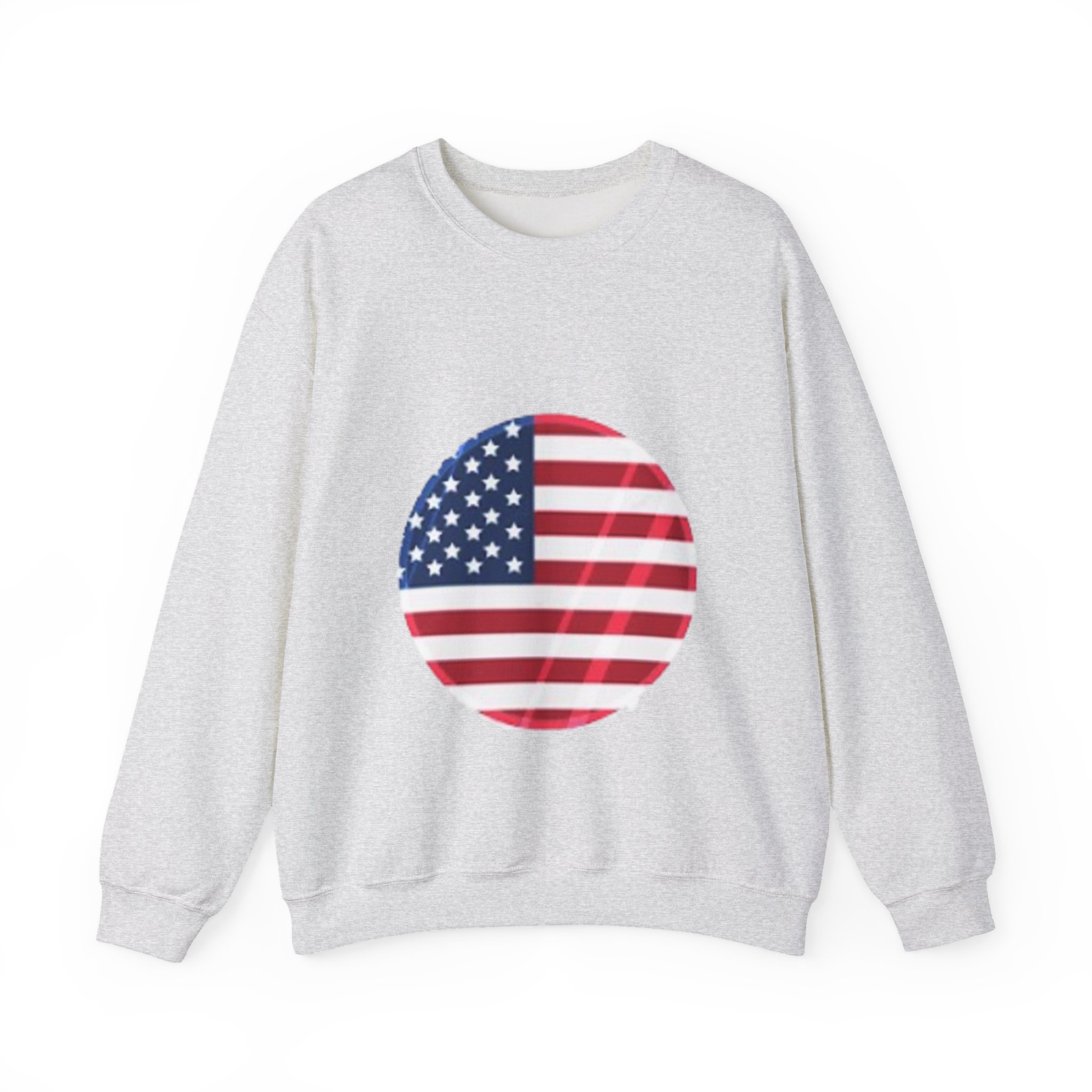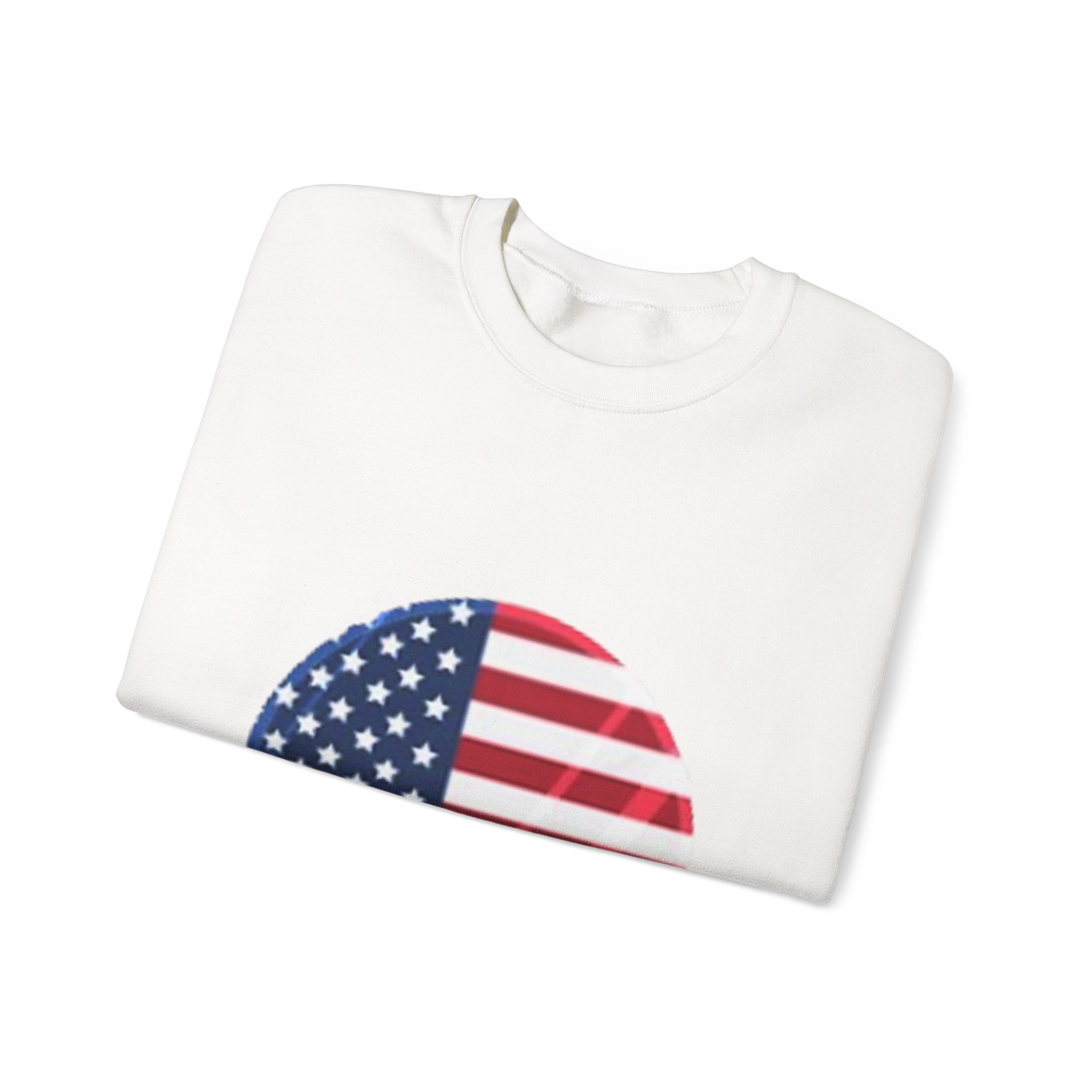 Soft, sturdy crewneck sweatshirt with a bold, circular American flag graphic that reads as both classic and quietly modern. The smooth white fabric makes the red, white, and blue design pop while the medium-heavy 50/50 cotton–poly blend keeps the piece warm without feeling bulky. Double-needle stitched seams and a ribbed collar hold their shape through washes. Wear it on cool mornings at the park, layered for a backyard barbecue, or as a low-key way to show national pride at community events. The tear-away neck label and ethically sourced cotton add thoughtful comfort and conscience to everyday wear.