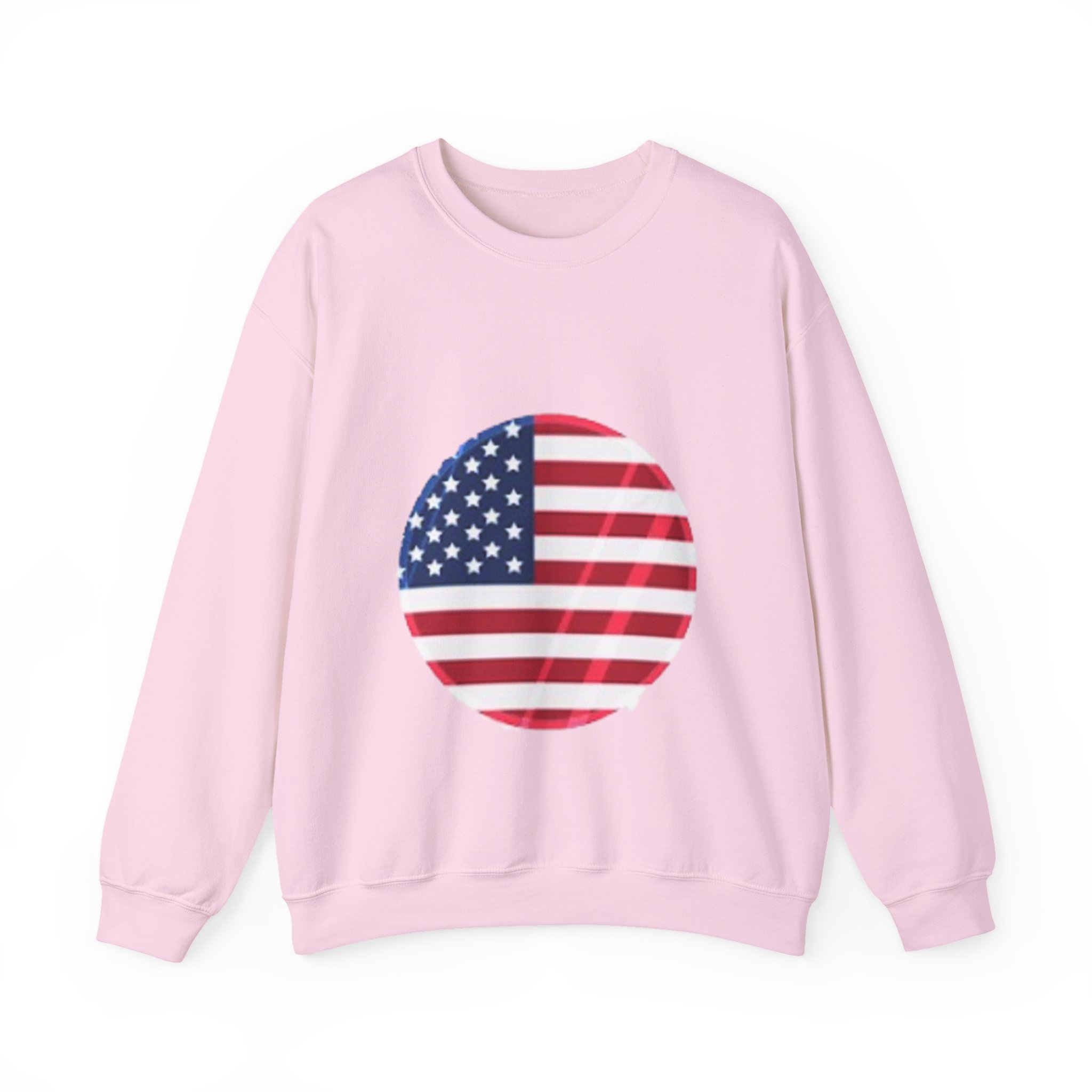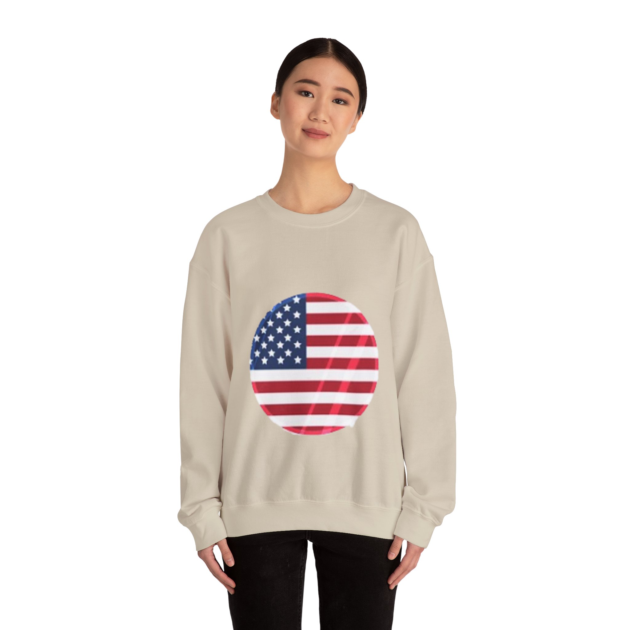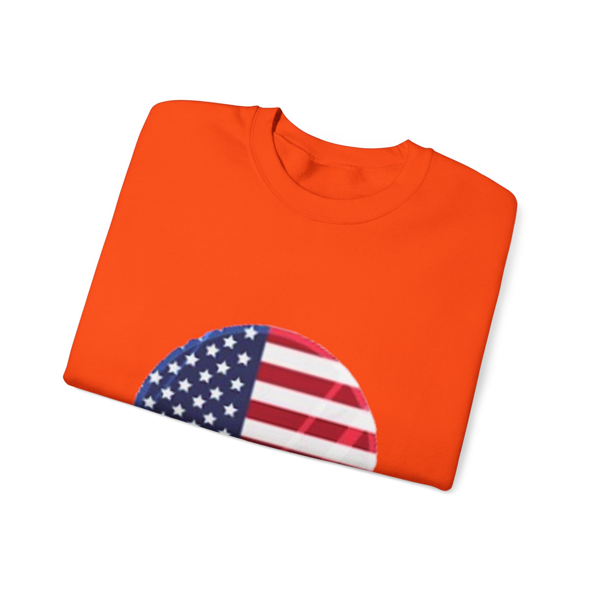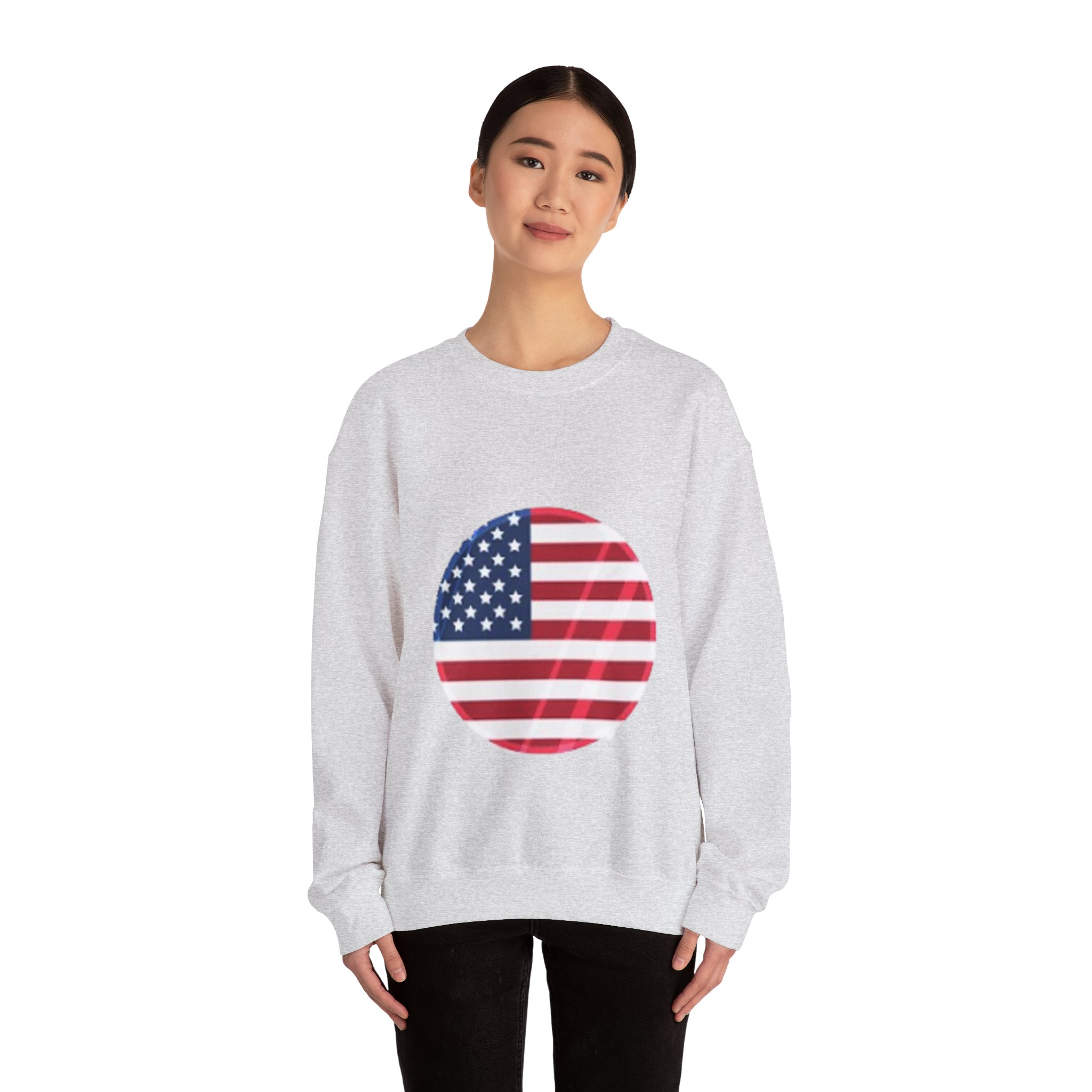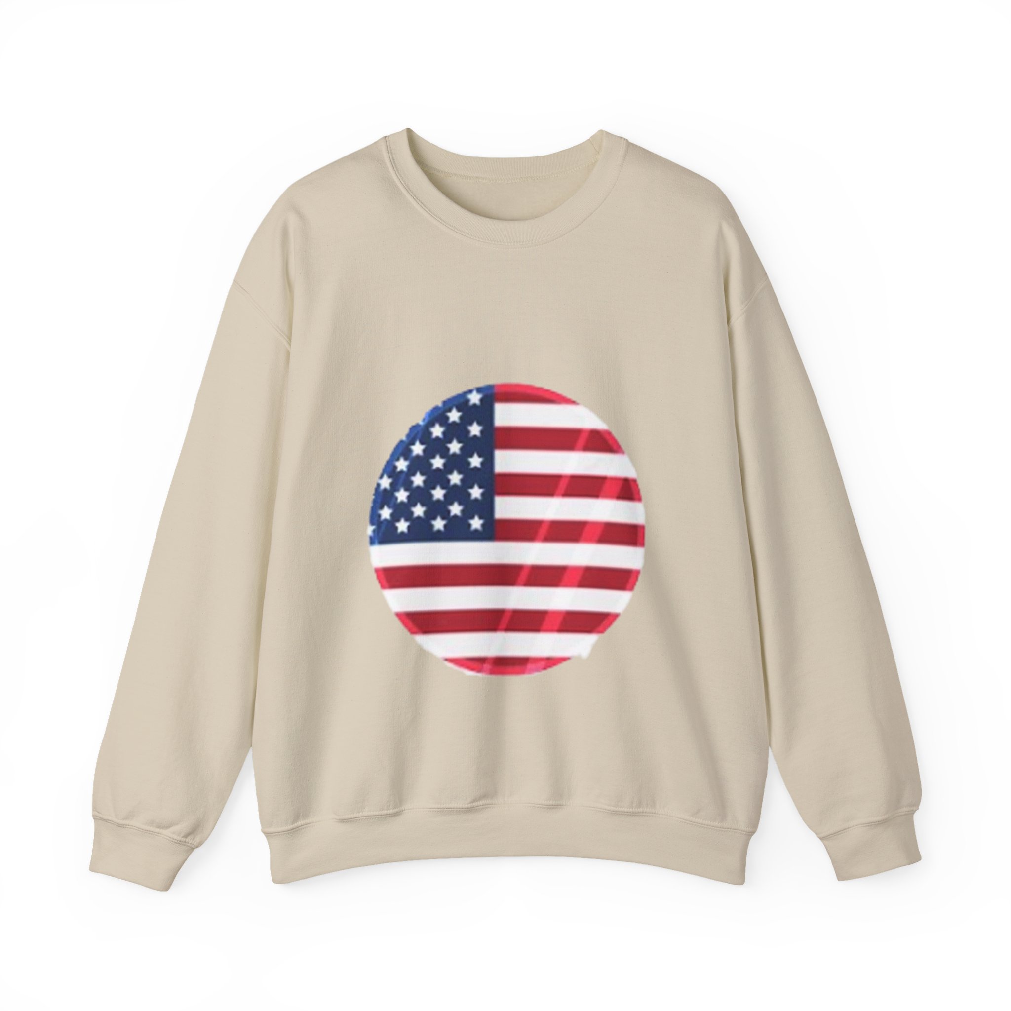 Soft, sturdy crewneck sweatshirt with a bold, circular American flag graphic that reads as both classic and quietly modern. The smooth white fabric makes the red, white, and blue design pop while the medium-heavy 50/50 cotton–poly blend keeps the piece warm without feeling bulky. Double-needle stitched seams and a ribbed collar hold their shape through washes. Wear it on cool mornings at the park, layered for a backyard barbecue, or as a low-key way to show national pride at community events. The tear-away neck label and ethically sourced cotton add thoughtful comfort and conscience to everyday wear.