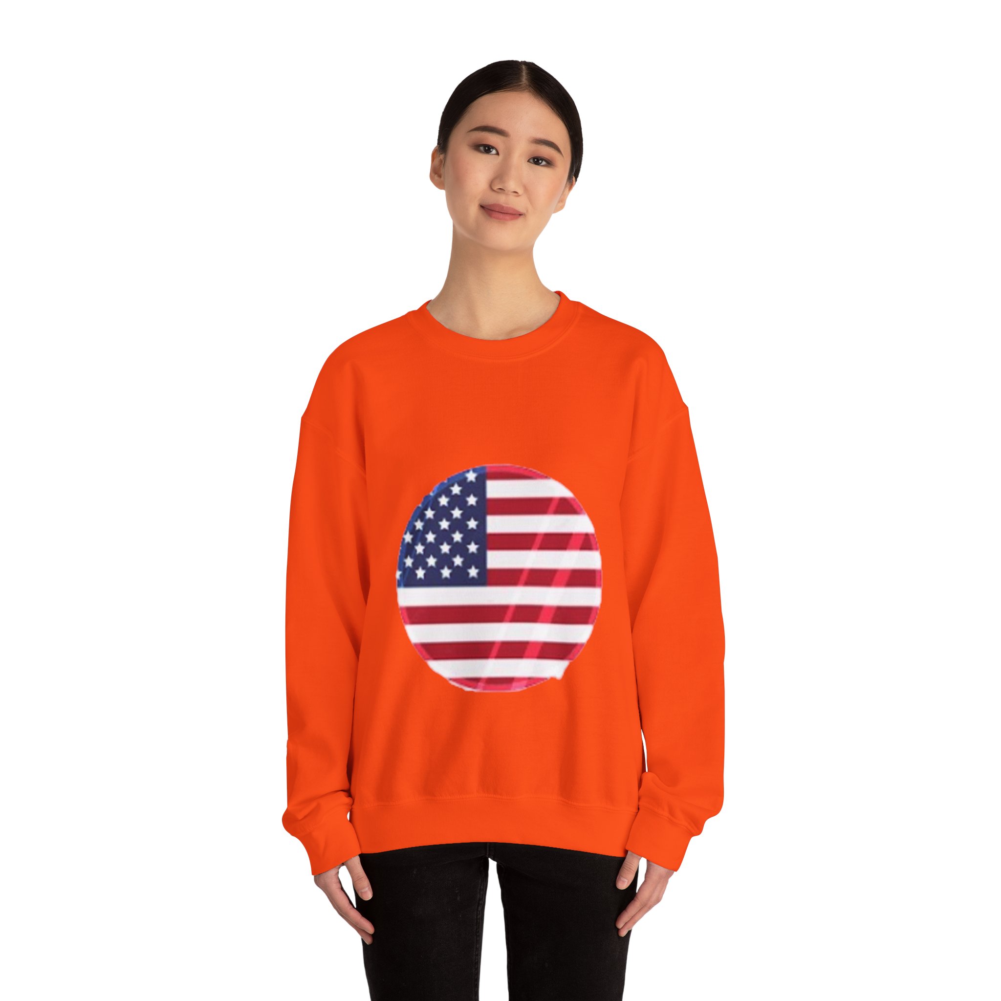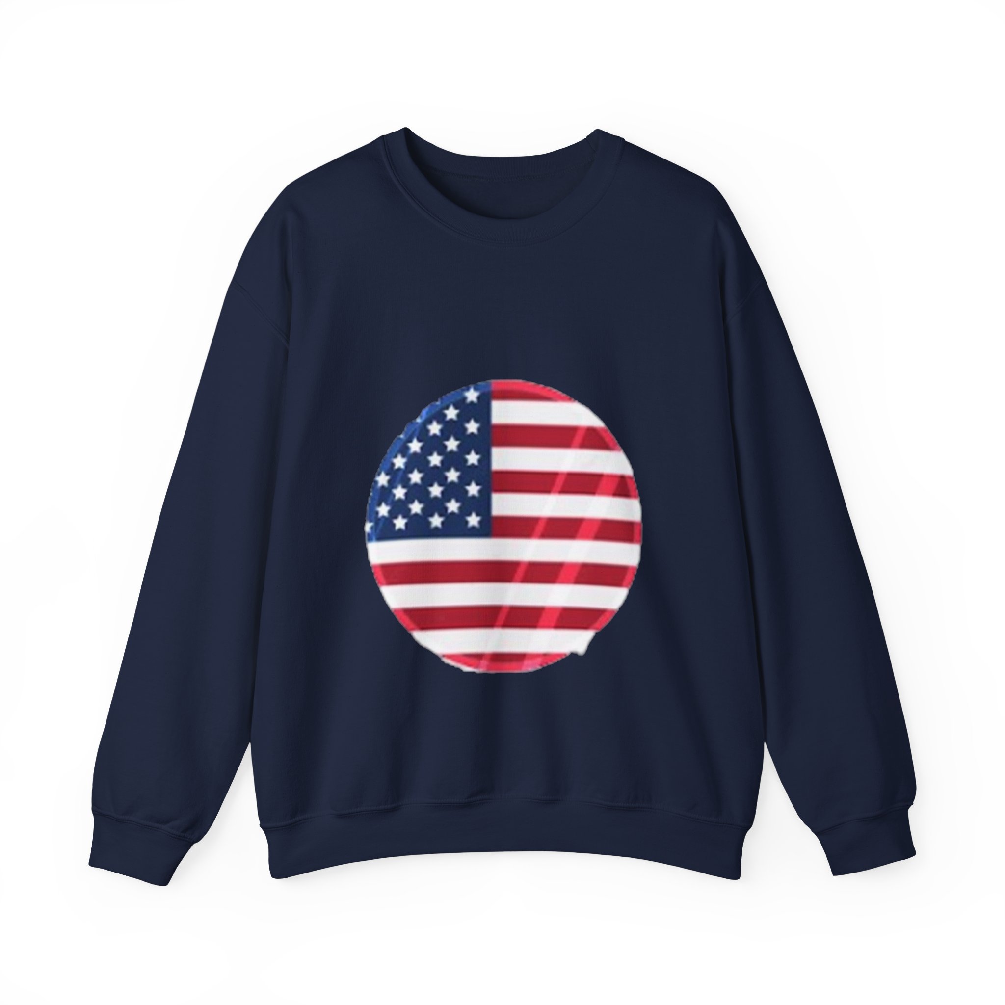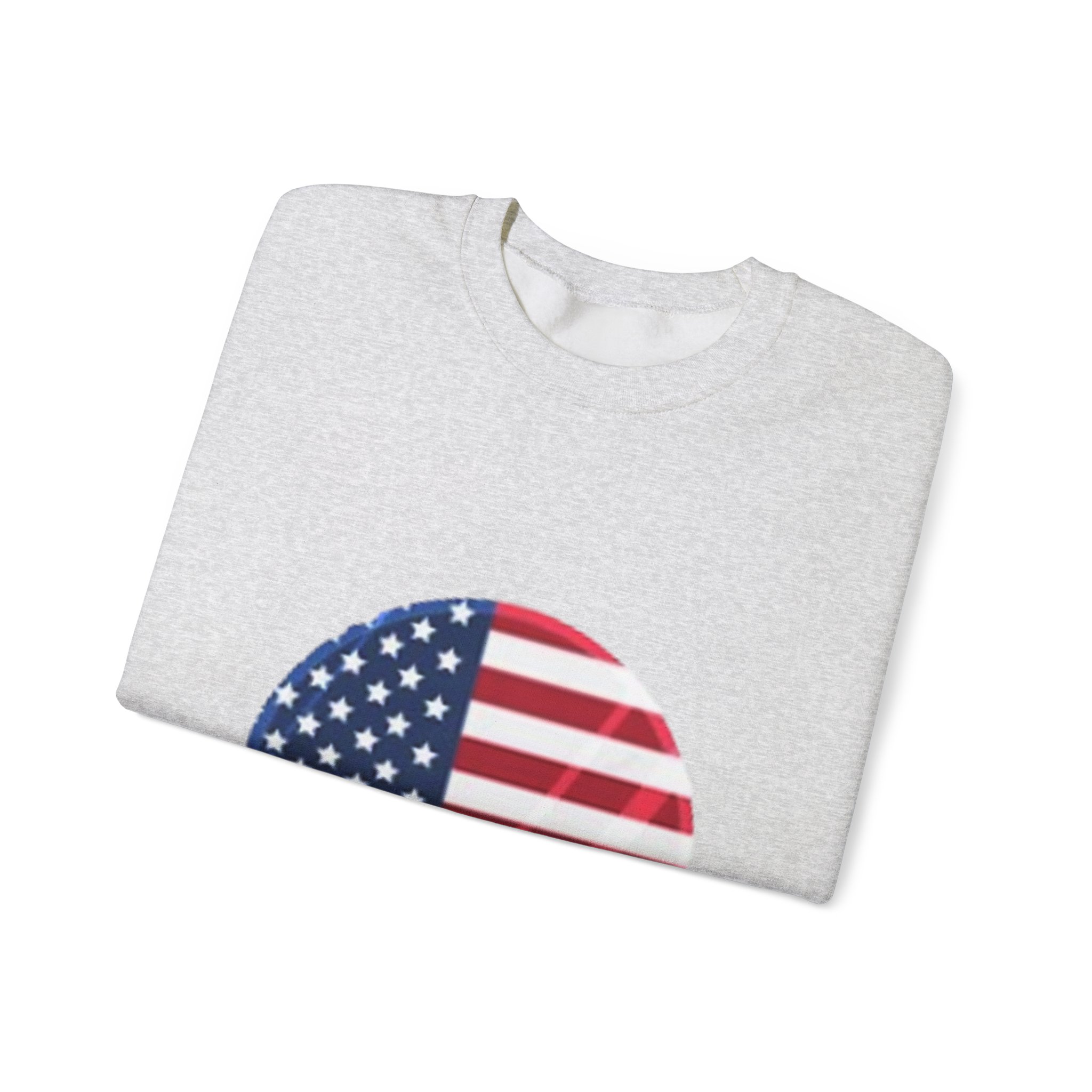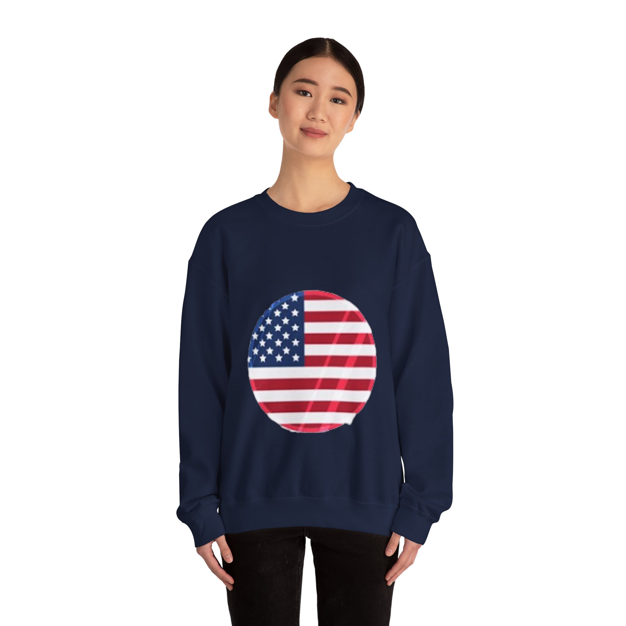 Soft, sturdy crewneck sweatshirt with a bold, circular American flag graphic that reads as both classic and quietly modern. The smooth white fabric makes the red, white, and blue design pop while the medium-heavy 50/50 cotton–poly blend keeps the piece warm without feeling bulky. Double-needle stitched seams and a ribbed collar hold their shape through washes. Wear it on cool mornings at the park, layered for a backyard barbecue, or as a low-key way to show national pride at community events. The tear-away neck label and ethically sourced cotton add thoughtful comfort and conscience to everyday wear.
