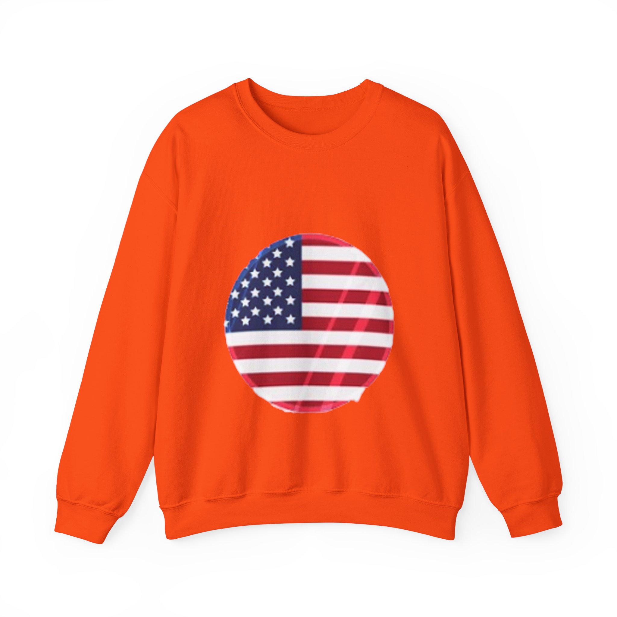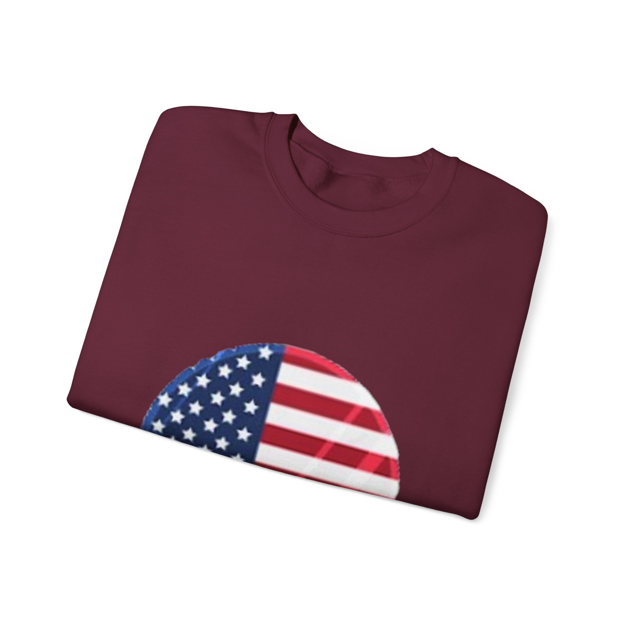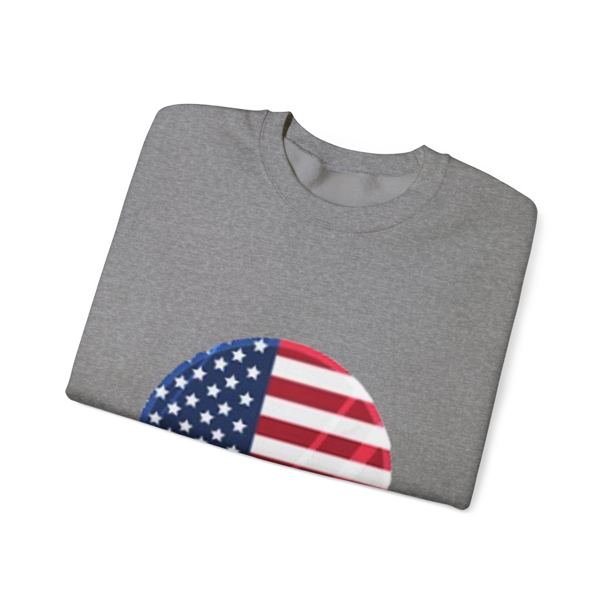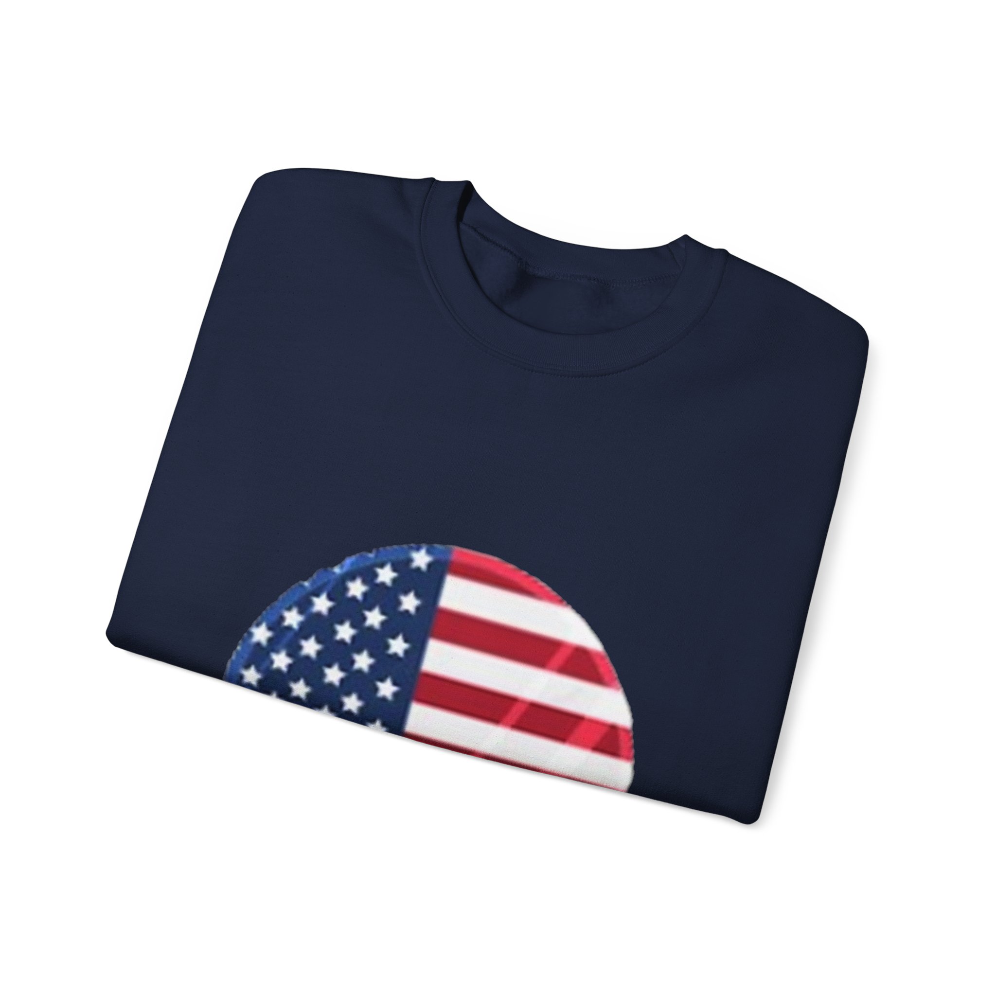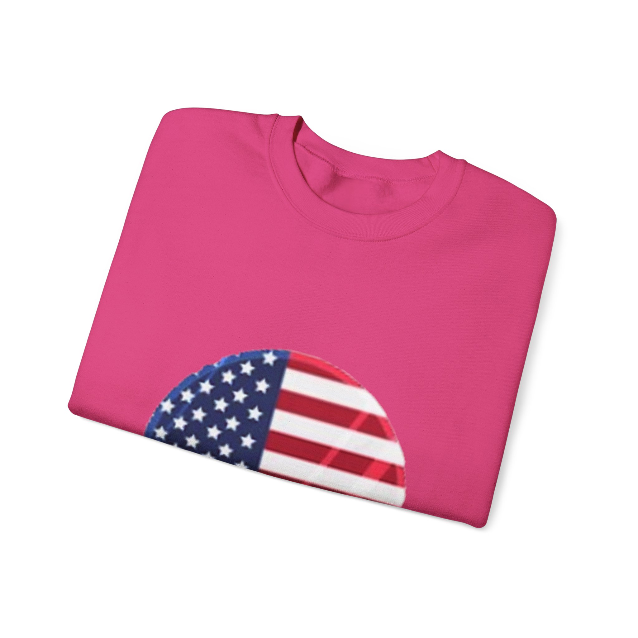 Soft, sturdy crewneck sweatshirt with a bold, circular American flag graphic that reads as both classic and quietly modern. The smooth white fabric makes the red, white, and blue design pop while the medium-heavy 50/50 cotton–poly blend keeps the piece warm without feeling bulky. Double-needle stitched seams and a ribbed collar hold their shape through washes. Wear it on cool mornings at the park, layered for a backyard barbecue, or as a low-key way to show national pride at community events. The tear-away neck label and ethically sourced cotton add thoughtful comfort and conscience to everyday wear.