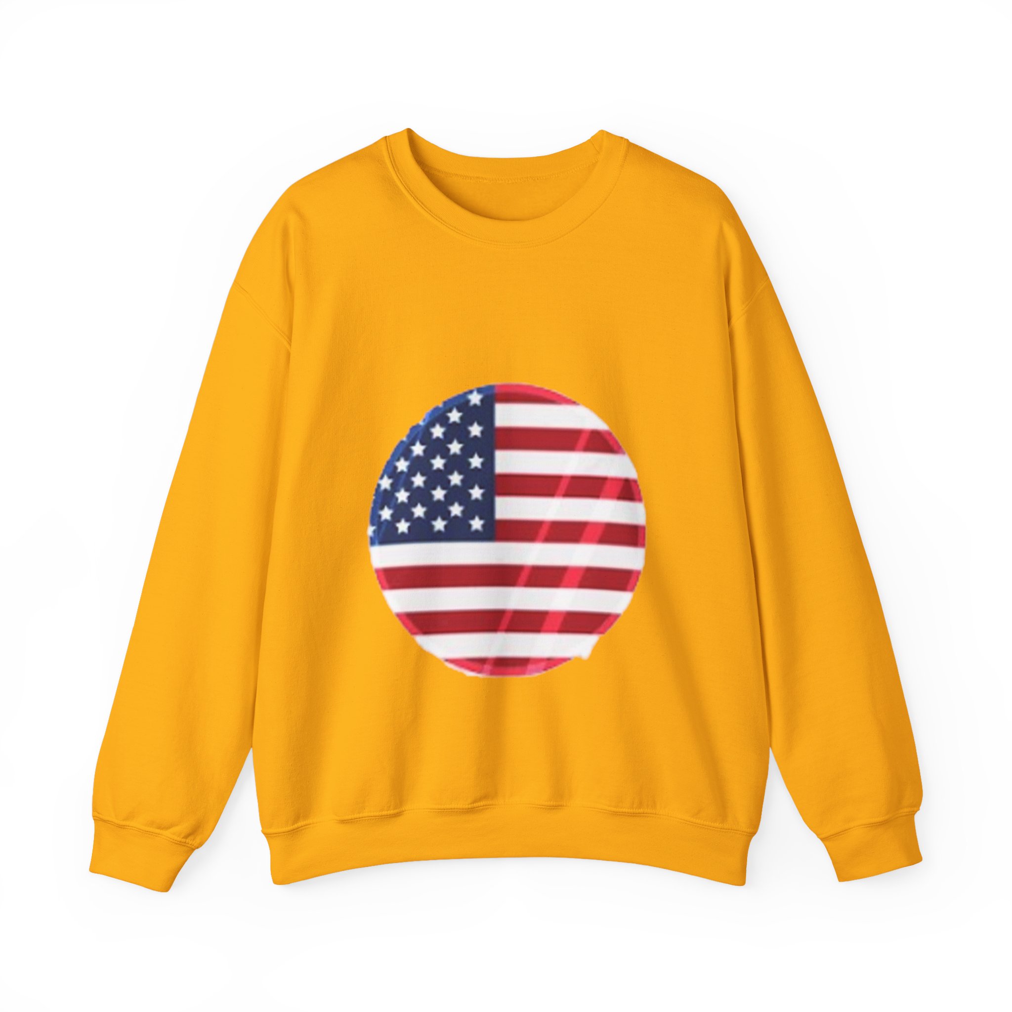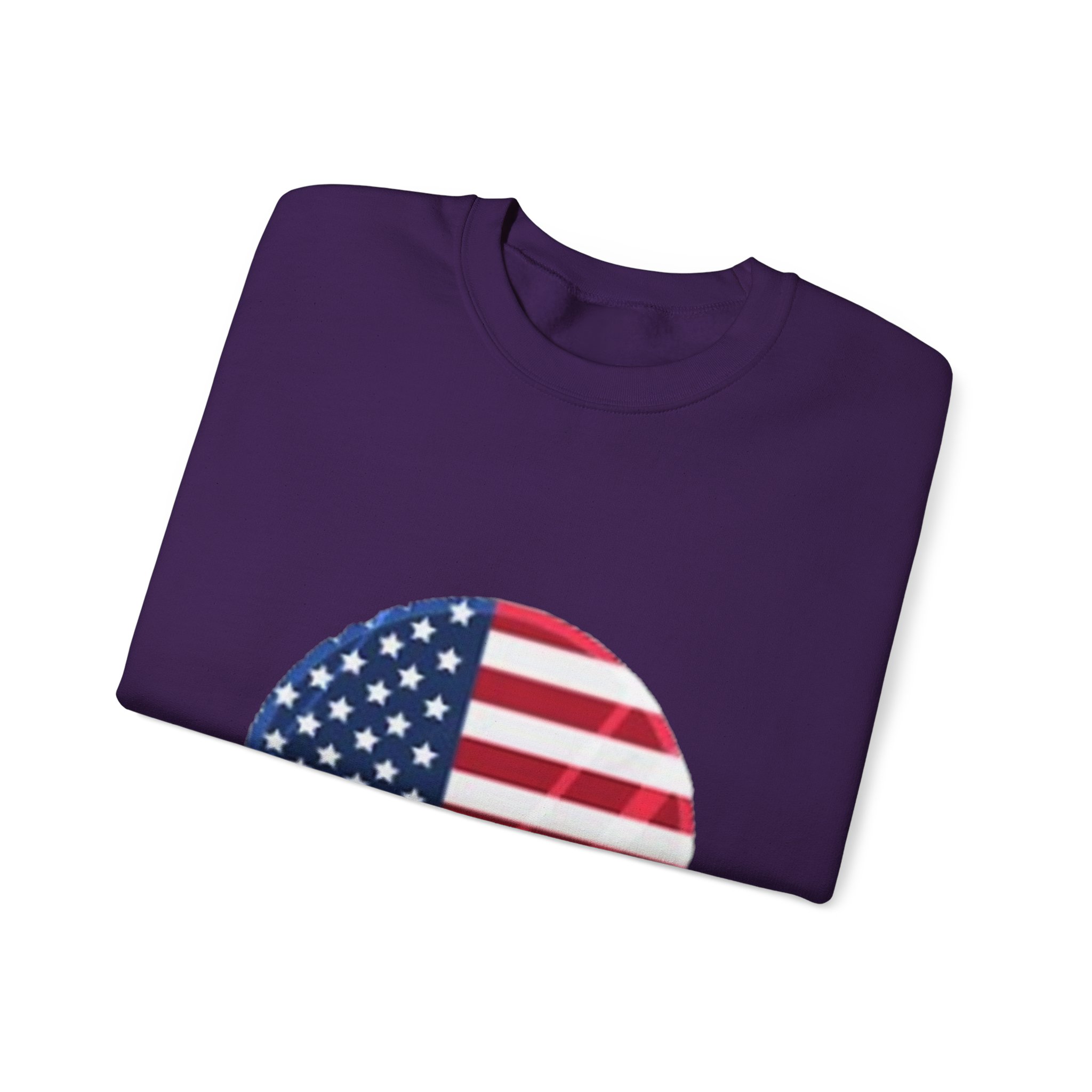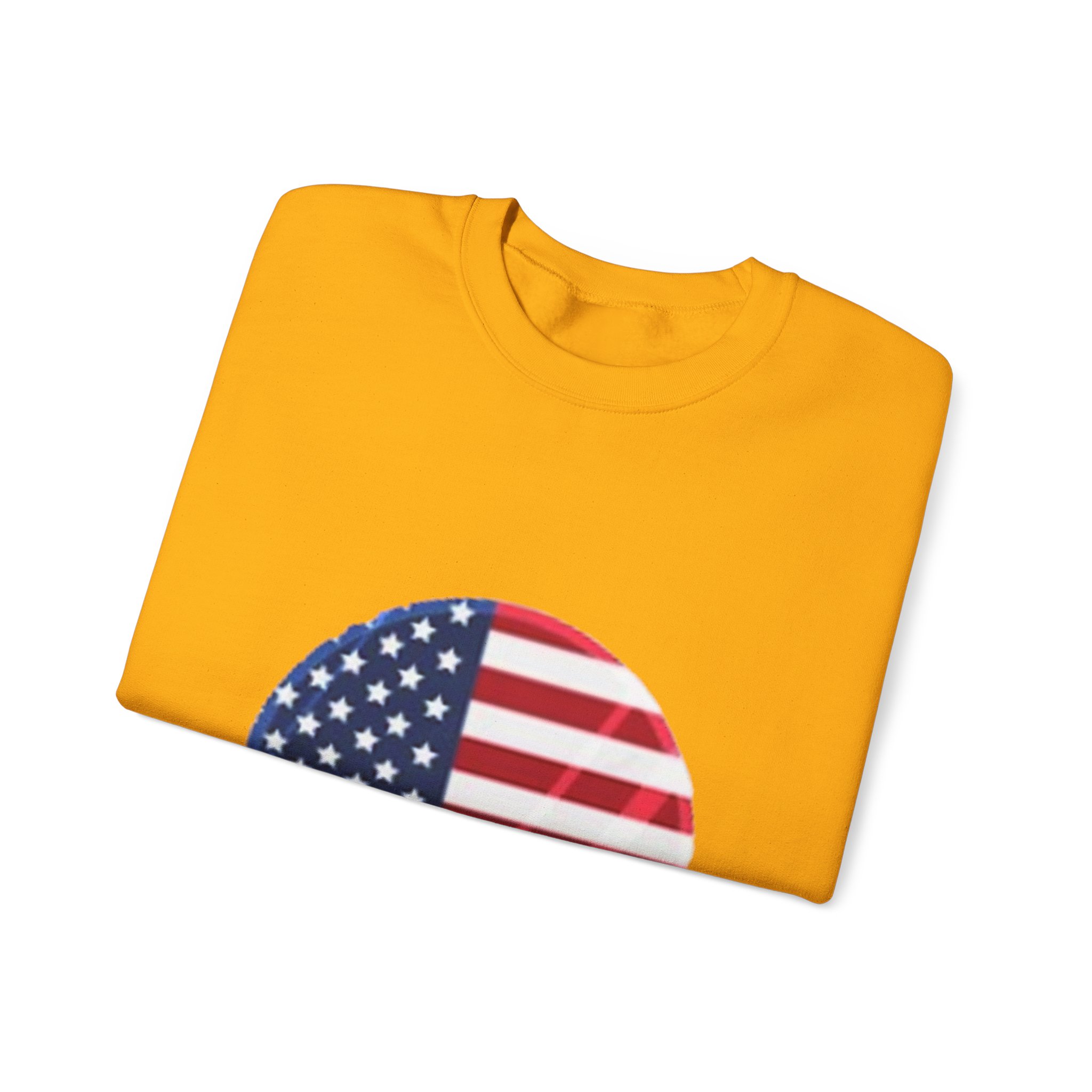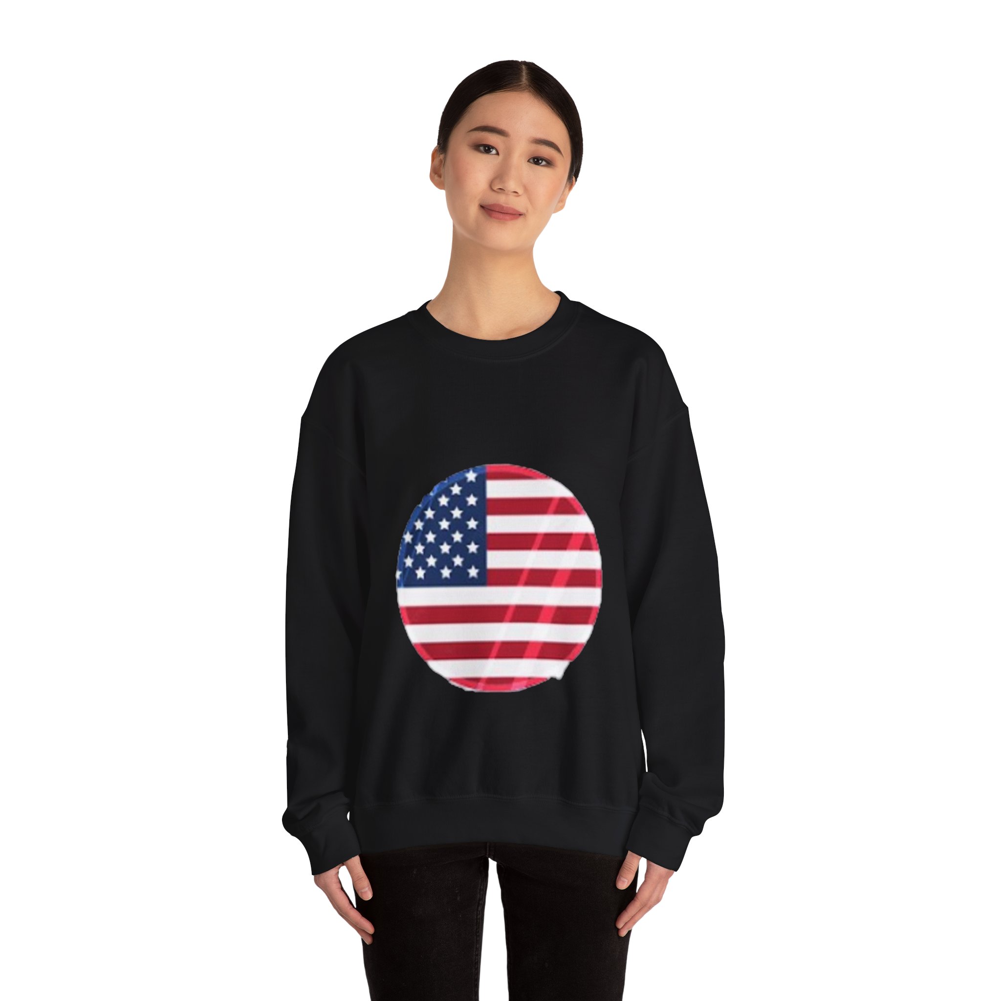 Soft, sturdy crewneck sweatshirt with a bold, circular American flag graphic that reads as both classic and quietly modern. The smooth white fabric makes the red, white, and blue design pop while the medium-heavy 50/50 cotton–poly blend keeps the piece warm without feeling bulky. Double-needle stitched seams and a ribbed collar hold their shape through washes. Wear it on cool mornings at the park, layered for a backyard barbecue, or as a low-key way to show national pride at community events. The tear-away neck label and ethically sourced cotton add thoughtful comfort and conscience to everyday wear.
